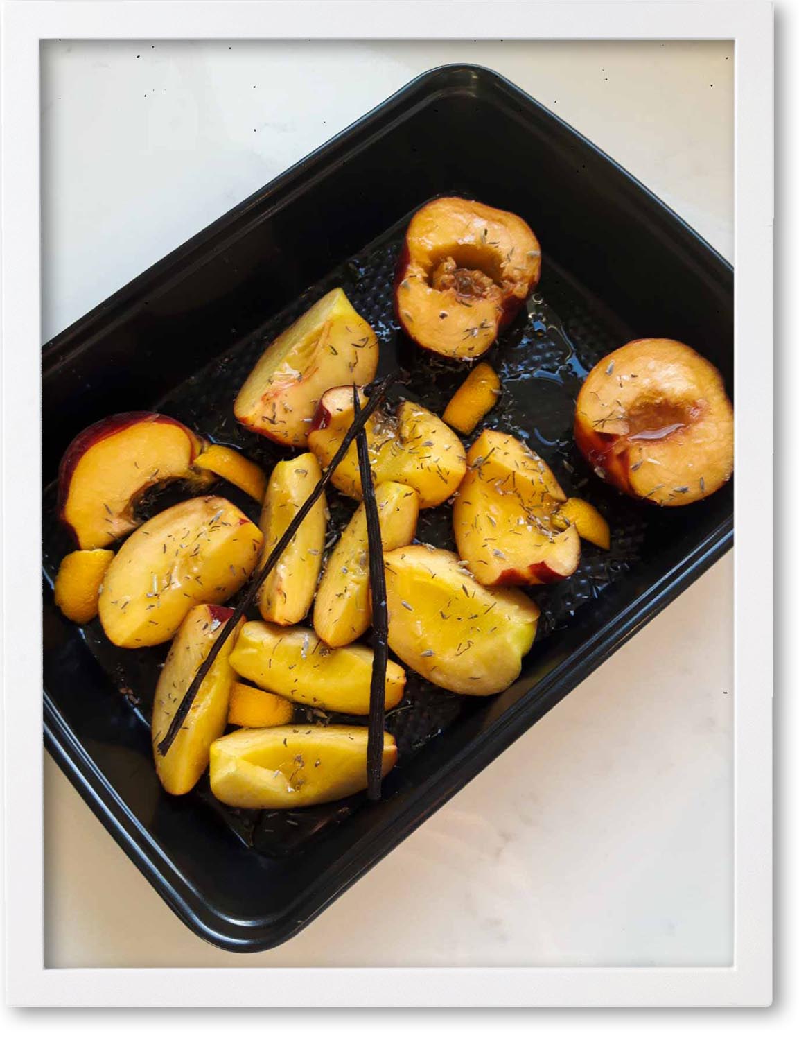Sprinkle the thyme and the dried lavender flowers over the peaches (due to its strong flavour, a few pinches of lavender is all you need).