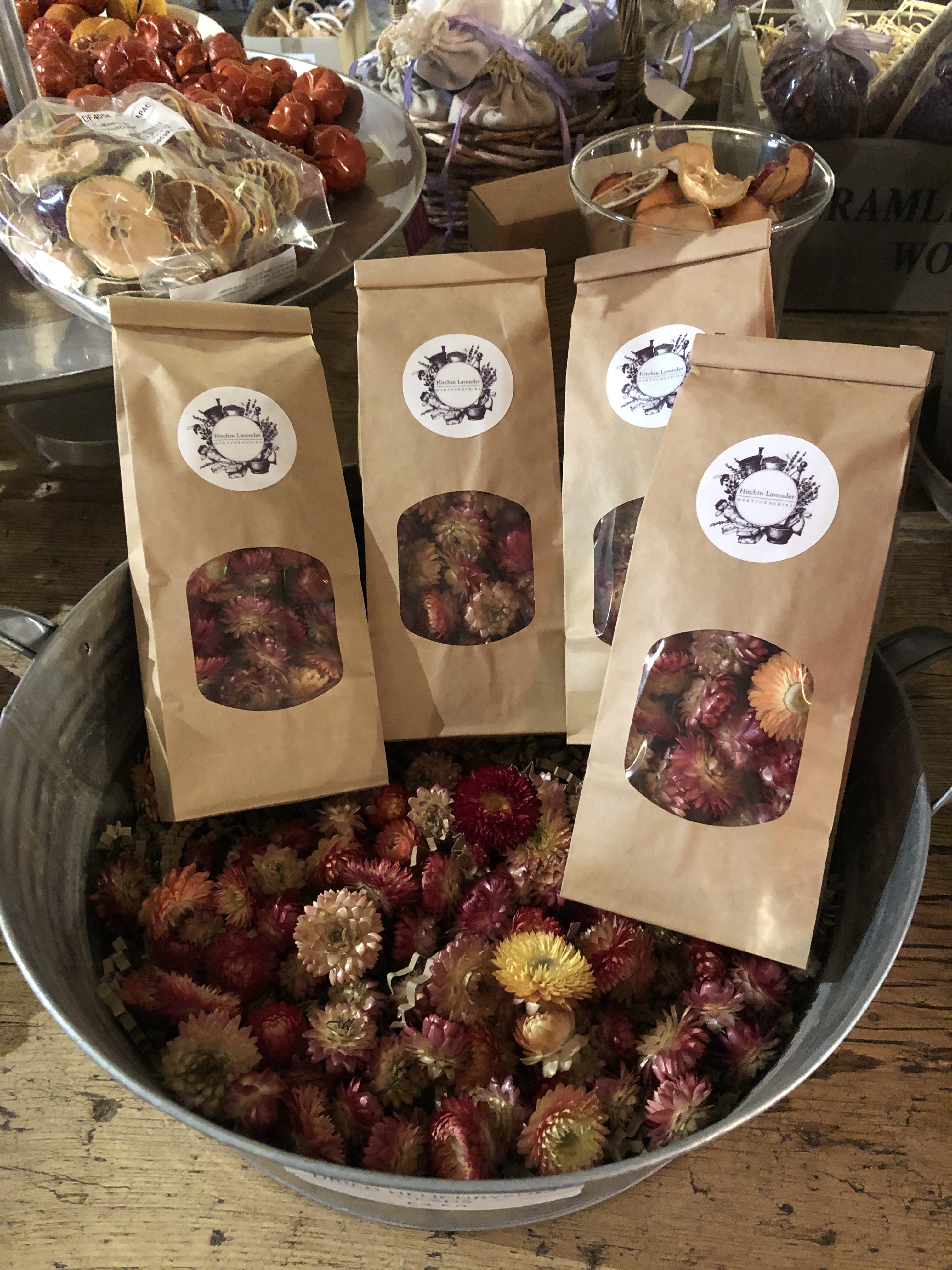 The wreath kits and dried flowers can be purchased online or in person in our shop which will be open again in our barn from Thursday 3rd December. Our opening hours will be Monday to Friday 10.00am – 3.00pm. You’ll also find us in our German style chalet stall in Hitchin’s Christmas market from 3rd December. We’ll be there every day from 10.00am – 5.00pm and until 7.00pm on a Thursday night. More on that next time!