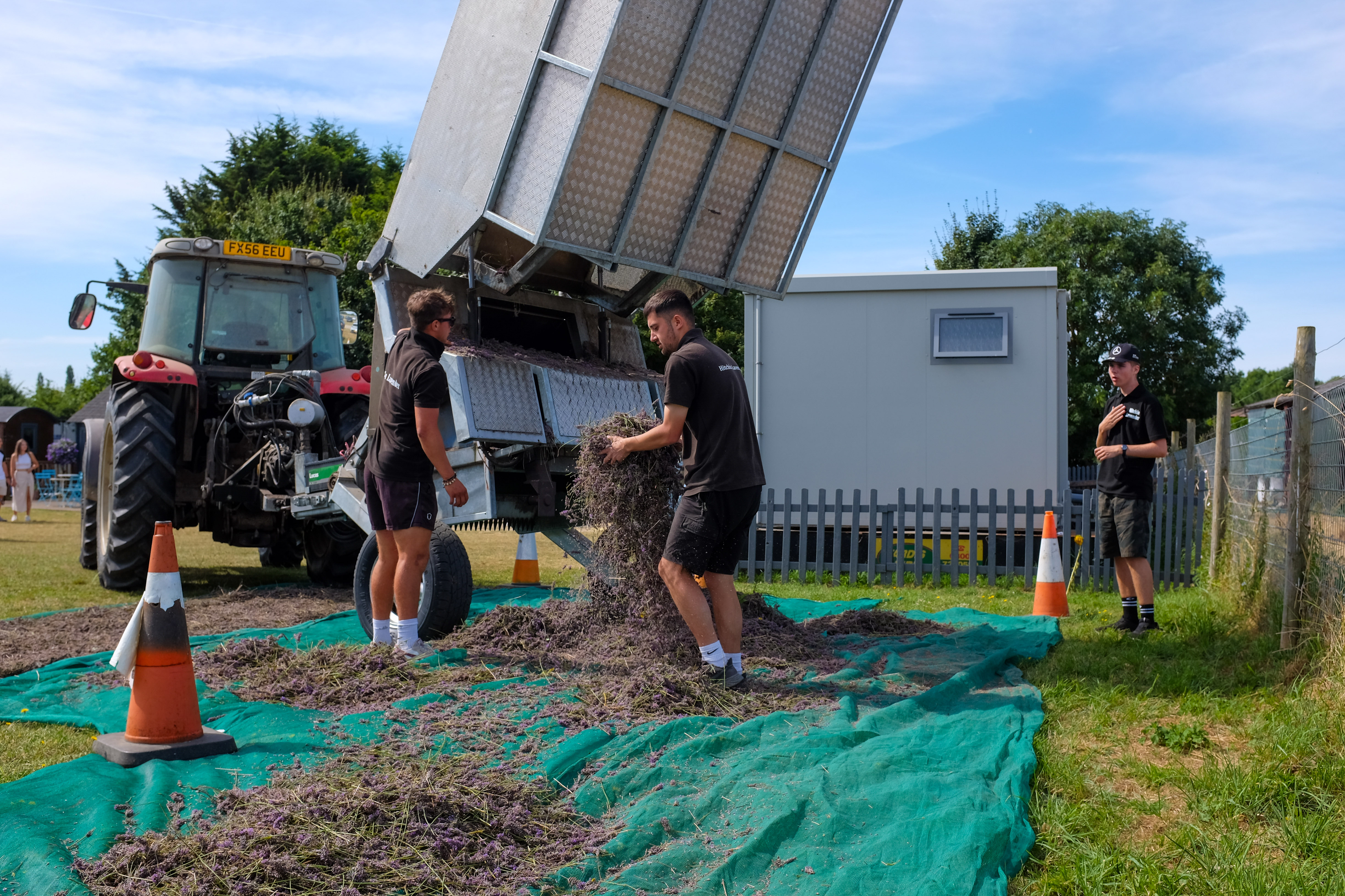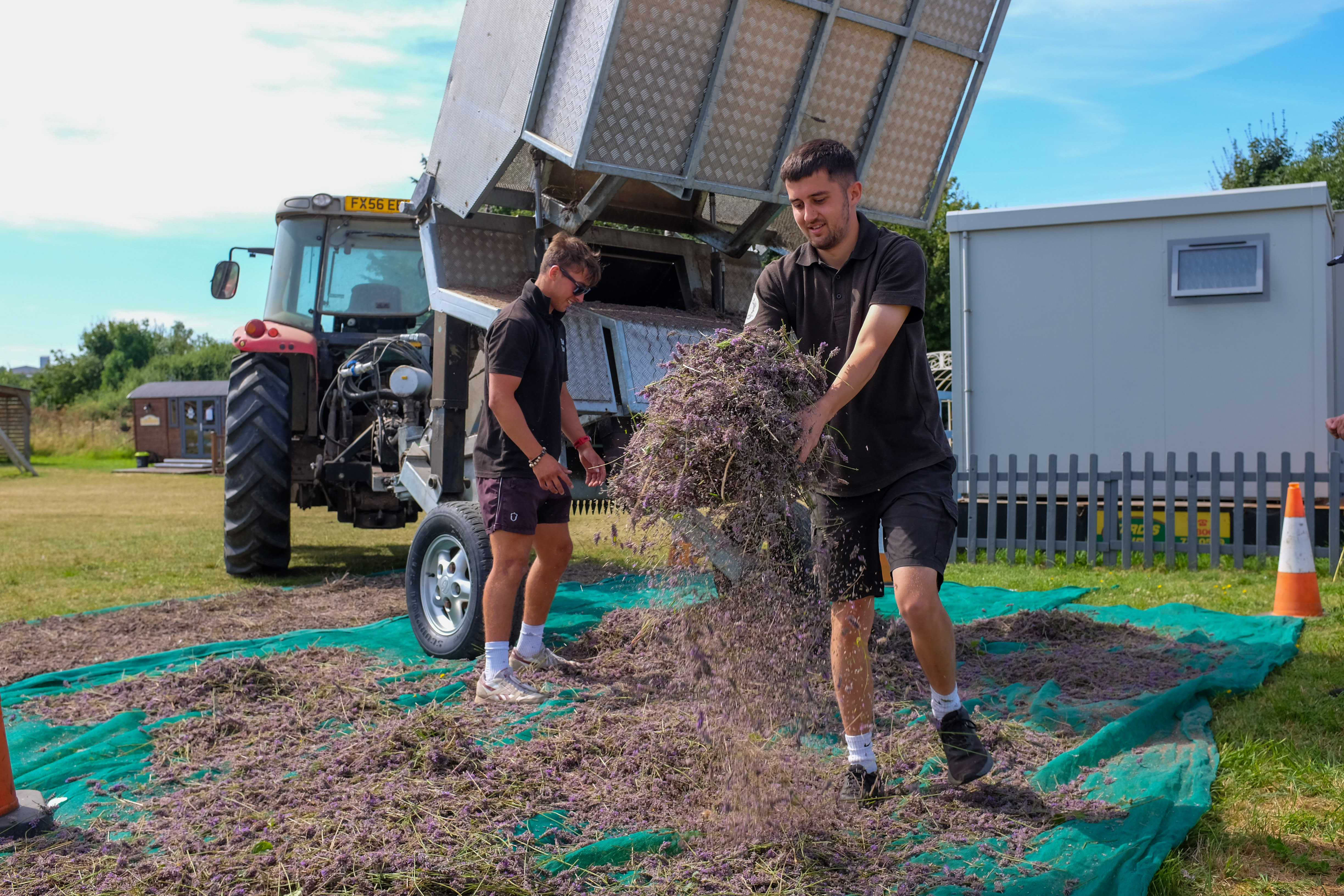 Once our trailer is full of harvested lavender flowers, we empty it out onto tarpaulin sheets and allow it to dry naturally outside. Here you can see us scattering the harvested lavender evenly to give it space to dry out: